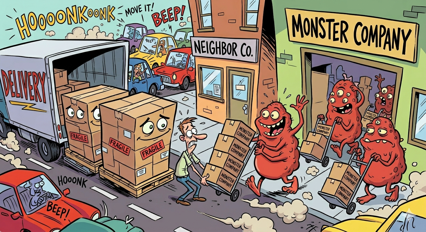 ある平日の朝、モンスター・カンパニーの前は、いつになく騒がしい幕開けとなりました。道幅の狭い道路は車で溢れかえり、隣の会社には2パレット分もの大量の荷物が届いたばかり。しかし、隣の会社の受け取り担当者はたった一人で、途方に暮れていました。さらに追い打ちをかけるように、モンスター・カンパニーの荷物を積んだトラックも到着し、交通は今にも麻痺しそうな状態でした。